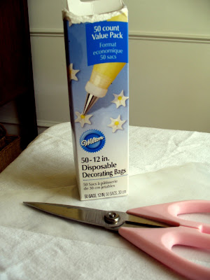 After the cupcakes have been baked and thoroughly cooled, I prepare to decorate them with a disposable decorater icing bag and a metal "star" decorating tip.
