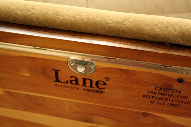 I had every intention of painting my cedar chest, until I realized that was a bigger project than I wanted to take on. (You can see that before I decided to paint it I had filled in the engraved hearts with wood filler.) Instead, I decided to “slipcover” it.
