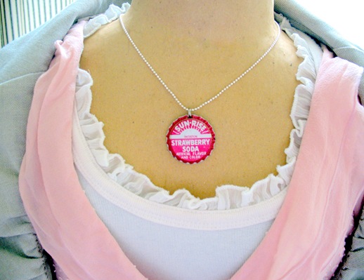 Remember Jane? Today, she is showing off a strawberry soda pop bottle necklace that I made. On a trip to Savannah, Georgia, I picked up this vintage pop top at a fun boutique for pennies. My sister in law was with me, and she picked up a bunch to make into refrigerator magnets (another fun idea!) I thought it was so cute, that I decided to make it into a pendant. I already had a chain (sometimes I use the same chain, and then just switch my pendants out). Simply take a hammer and a skinny nail to puncture a hole at the top of the bottle top. Thread a "jump ring" through it, and slip on the chain! You can find jump rings in the jewelry section at Walmart or any craft store. Usually they come several to a package for less than a few dollars. You can use the others for any other project you come up with later on.